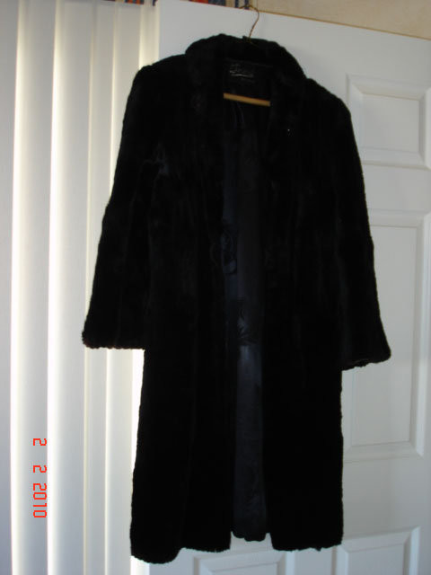 SEAL COAT black, fully lined in sat Expert repairs to lining normal wear @top button normal wear @cuffs, pocke normal wear at bottom fro Excellent condition for i