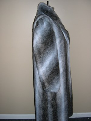 Faux Grey Raccoon Long Coat Faux Grey Raccoon Coat Shawl Collar Shown Color Shown is Grey Hook and Eye Closure Cuff Shown Is Straight Cuff Manufacturing: USA