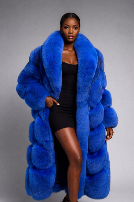 Dyed Blue & Black Fox Fur Headband Dyed Blue & Black Fox Fur Headband Dyed Padded Grosgrain Lining Velcro Closure Fur Origin: Norway Manufacturing: USA