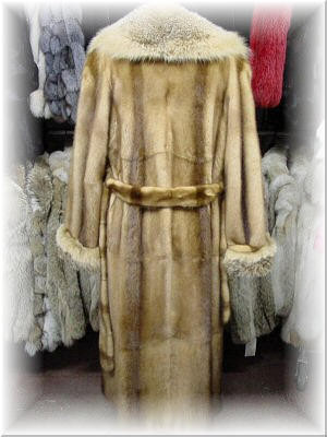 Custom Made Only - 2 -4 weeks Full Skin Whiskey Mink Coat with Coyote Collar and Cuffs Full Skin Whiskey Mink Fur Coat with Coyote Fur Collar and Fur Cuffs Large Shawl Collar Shown Full Skin Belt Included Full Skin Coyote Collar and Cuffs Cross Back 13 1/2" Sleeve Length 31" Length of Garment 54" Double / Turn Back Cuffs Stright Sleeves Size 6 Hook and Eye Closure Fur Origin: USA Manufacturing: USA This is our sample item and it is only available in this size and color shown