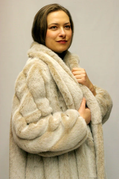 This is 100% faux fur not real. Faux Fur Mink Coat Faux Fur Snow Top Coat Fur Type: Faux Mink Collar: Shawl Length 48 Inches Hook and Eyes Closure Manufactured: USA